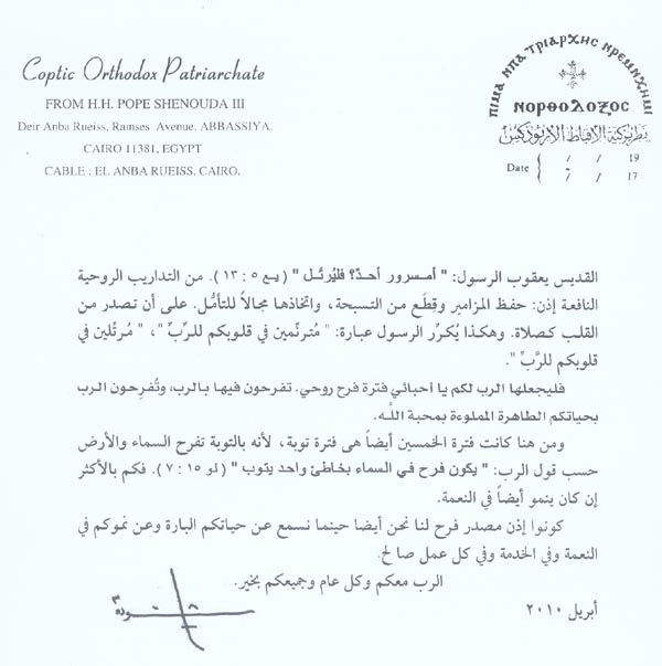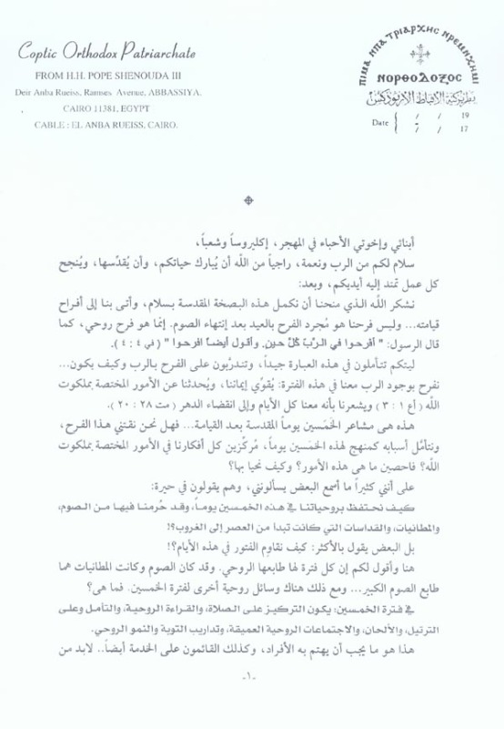 May the Lord grant it to be a period of spiritual joy for you my beloved, in which you rejoice in the Lord and to make the Lord rejoice by your pure lives that are filled with God’s love. Hence, the period of these fifty days was also a period of repentance, since by repentance heaven and earth rejoice according to the Lord’s saying, “There will be more joy in heaven over one sinner who repents.” (Luke 15:7) How much more so if he also grows in grace. Therefore, be a source of joy to God, His angels and to heaven. Be also a source of joy for us when we hear about your righteous life, your growth in grace, ministry and in every good work. The Lord be with you and wishing you a happy Feast of the Resurrection.