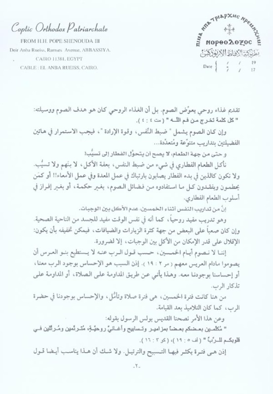 In the period of the fifty days, the focus is on prayer, spiritual reading, contemplation, praising and hymns, deep spiritual meetings, exercises of repentance and spiritual growth.This is what each individual as well as those who are responsible for the ministry should be concerned with. It is inevitable to present spiritual nourishment to take place of the fast. Spiritual nourishment was the aim and the means of the fast, “Every word that proceeds from the mouth of God.” (Matthew 4:4)