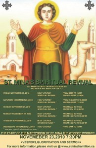 In celebration of the Feast of the Martyrdom of Saint Mina the Wonder-Worker, under the auspices of His Holiness Pope Shenouda III and the presence of the Reverend Fathers the priests of the region, St. Mina’s Coptic Orthodox Church in Hamilton would like to invite you to a spiritual revival in the period from Friday, November 19th, 2010 till Wednesday, November 24th, 2010 according to the attached schedule. There will be daily liturgies and evening prayers that include vespers, glorifications and sermons. Please check out the poster or the calendar section for more details.