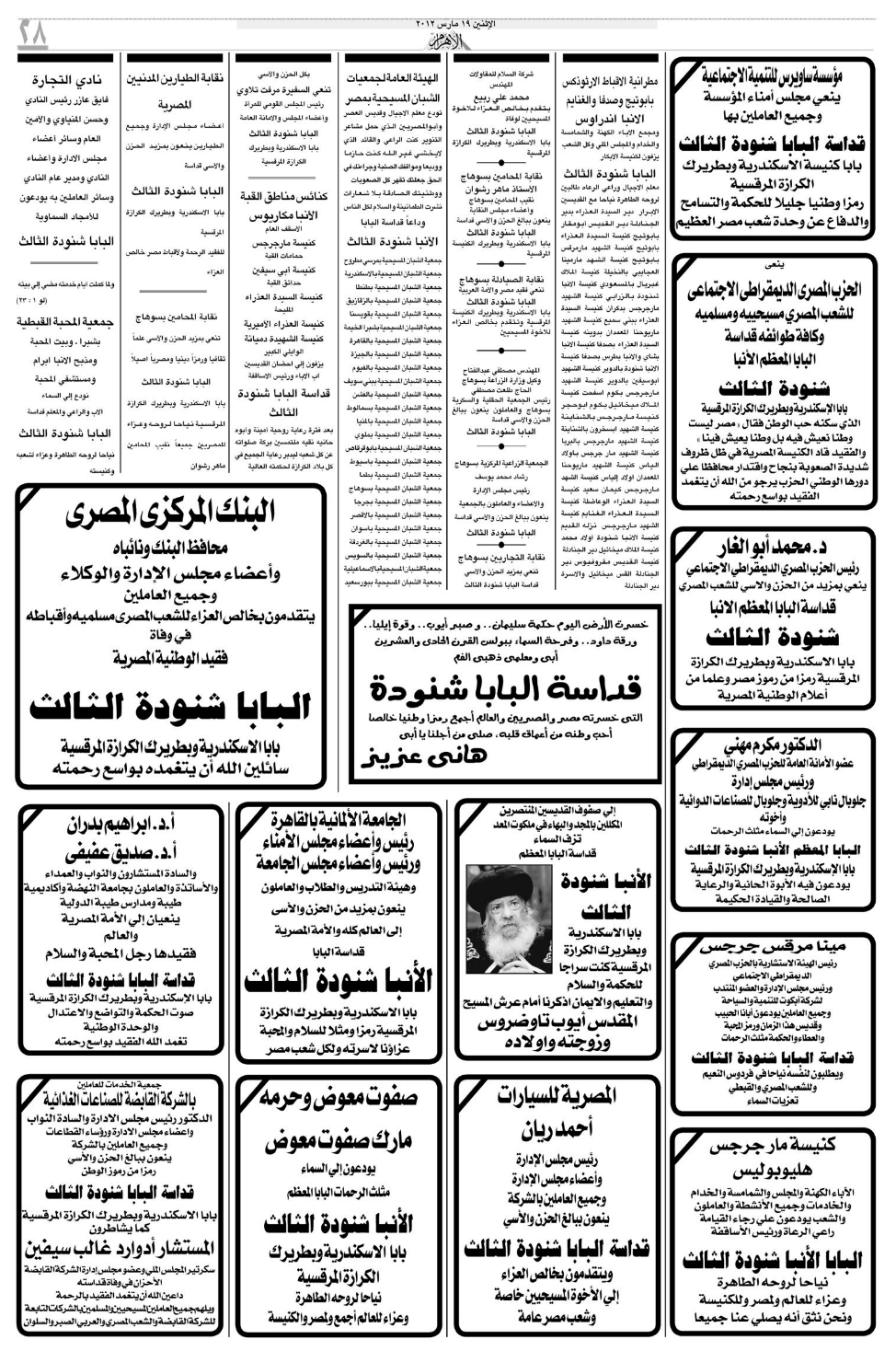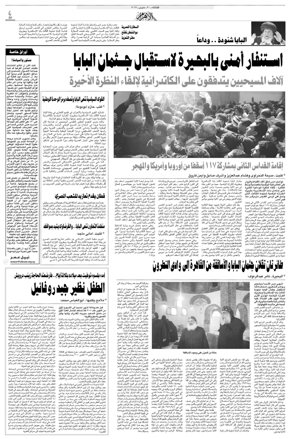 Below are some snapshots from the Egyptian newspapers regarding the departure of our beloved shepherd, Pope Shenouda III. |