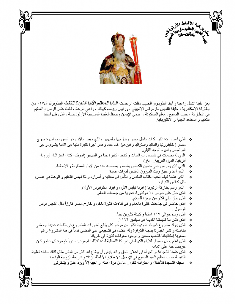 It is with a heavy heart, my beloved, that we bid farewell to our beloved Shepherd and father, thrice in mercy: His Holiness Pope Shenouda the 3rd. The 117th pope of Alexandria, the successor of St. Mark the Evangelist, the head of the priests, the shepherd of shepherds, the 13th disciple, the beloved of our Lord Jesus Christ, the teacher of generations, the protector of the doctrine of our Christian faith, and the Creed of the Coptic Orthodox. He is the one who remained Bishop of education and the religious and clerical institutions.