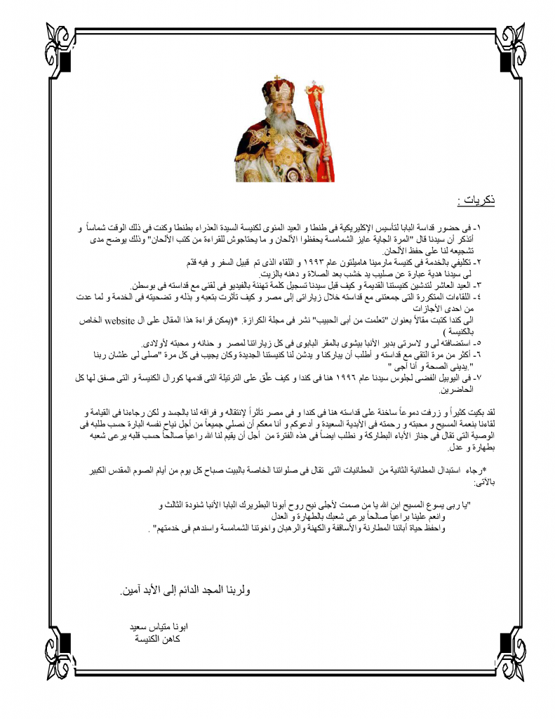 - The numerous times that I met with him during my visits to Egypt, where I was inspired by the fact that even in his old ailing age, his is still committed to serving, and sacrificing for the good of his flock. When I returned to Canada, I wrote an article titled “I learned from my Beloved Father”, and it was posted in El-Keraza magazine. The article is posted on our Church’s website.