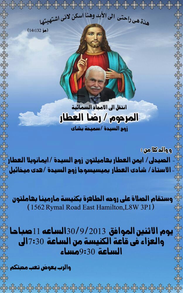 رقد فى الرب على رجاء القيامة الأستاذ رضا العطار السيدة سميحة بشاي ووالد كل من الصيدلي أيمن العطار (زوج السيدة إيمانويلا العطار) والأستاذ شادي العطار (زوج السيدة هدى ميخائيل).