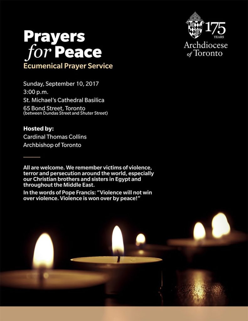 You are cordially invited ta attend an Ecumenical Prayer Service entitled “Prayer for Peace” on Sunday, September 10, 2017 from 3pm to 4pm at St. Micheal’s Cathedral Basilica (65 Bond Street, Toronto, ON M5B 1X5).