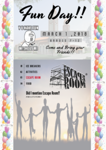 Cost: $20 (food, games “COYA Style”, escape room, and trasportation) per person (Grades 7 to 12)