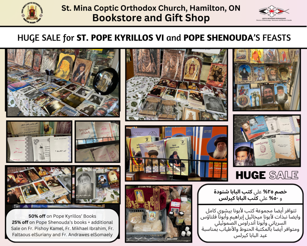 St. Mina’s Coptic Orthodox Church in Hamilton is pleased to inform you of its Bookstore and Gift Shop’s Huge Sale for St. Pope Kyrillos VI and Pope Shenouda’s feasts. This huge sale includes many of Pope Shenouda and Pope Kyrillos’ books as well as other items by Fr. Pishoy Kamel, Fr. Mikhael Ibrahim, Fr. Faltaous elSuriany and Fr. Andrawes elSumaely.