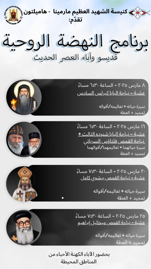 يسر كنيسة الشهيد العظيم مارمينا القبطية الأرثوذكسية – هاميلتون أن تدعوكم لحضور برنامج النهضة الروحية تحت عنوان “قديسو وآباء العصر الحديث”، حيث سنتأمل معًا في سير هؤلاء القديسين الذين أضاءوا الكنيسة في الأزمنة المعاصرة بتعاليمهم وأقوالهم وحياتهم المقدسة