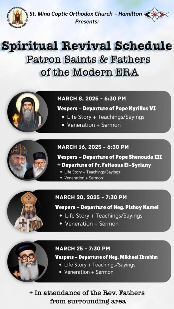 St. Mina Coptic Orthodox Church – Hamilton is delighted to invite you to our Spiritual Revival Program under the theme: “Saints and Fathers of the Modern Era”. Together, we will reflect on the lives of these saints, who illuminated the Church in contemporary times with their teachings, sayings, and holy lives.